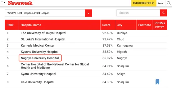 在《新闻周刊》(Newsweek)2024年度公布的日本最佳医院排名中,名古屋大学医学部附属病院位列全日本第五位。
