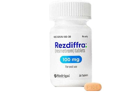 瑞司美替罗(Resmetirom、Rezdiffra)用于治疗伴有中度至晚期肝纤维化(符合F2至F3期纤维化)的非肝硬化性非酒精性脂肪性肝炎成人患者。需与饮食和运动联合使用。